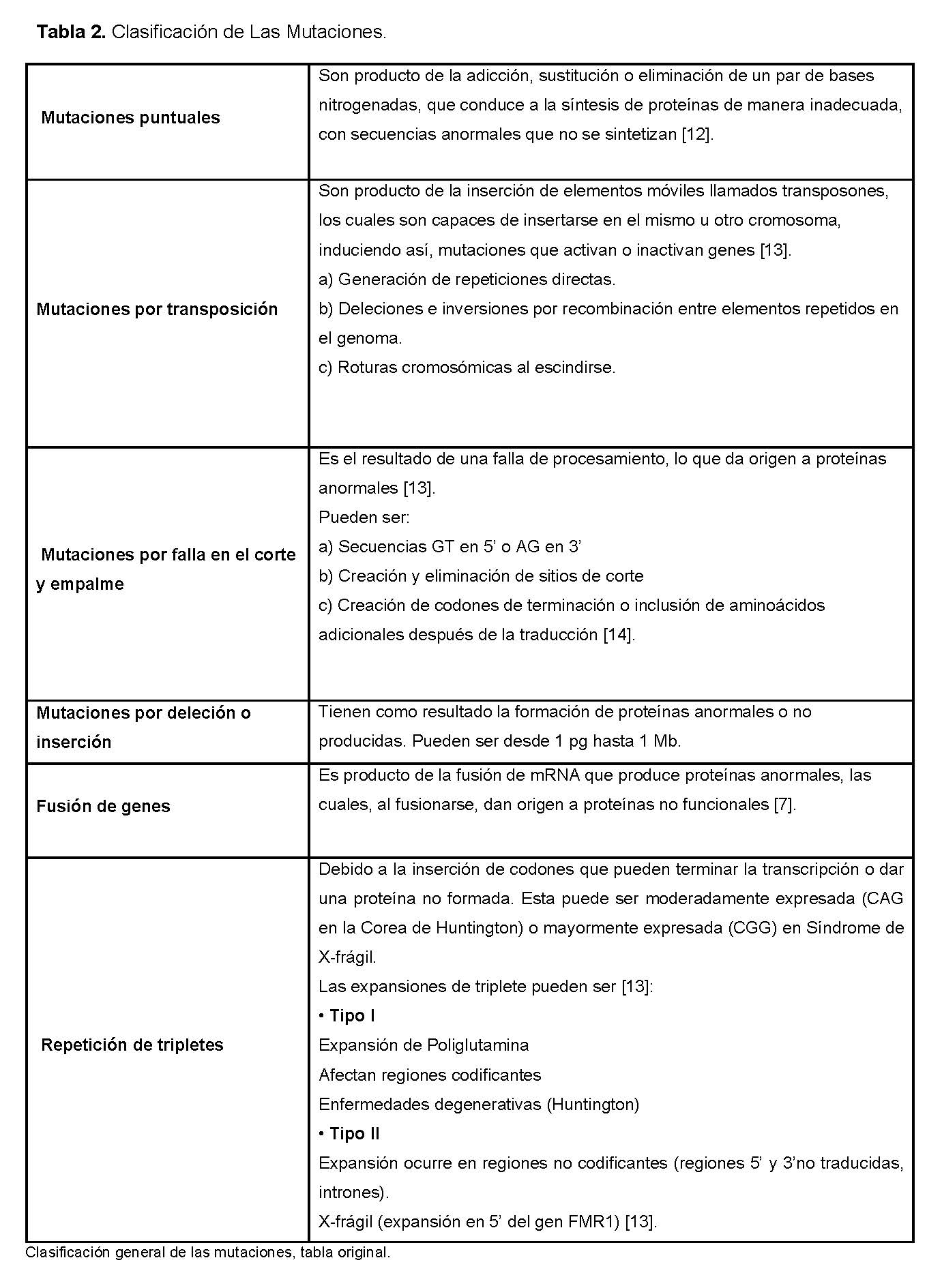 From the perspective of Molecular Pathology, mutations are classified as [9,11]: Point mutations, Transposition mutations, Splacing failure mutations, deletion or insertion mutations, Gene fusion, Triplet repeat (See table 2).