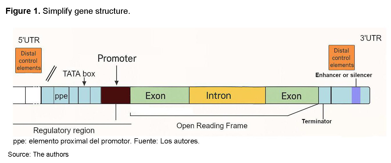 The structure of a gene is not limited to the sequences that encode proteins (exons), but includes multiple regulatory regions that determine when, where, and in what quantity a gene will be expressed. Among these are the promoter, which allows the initiation of transcription; introns, non-coding sequences removed in the RNA maturation process; and untranslated regions (UTR), which regulate the stability and translation of mRNA [3]. Likewise, proximal and distal control elements, such as TATA boxes, CAAT boxes, enhancers, and silencers, precisely modulate gene activity [1,4].