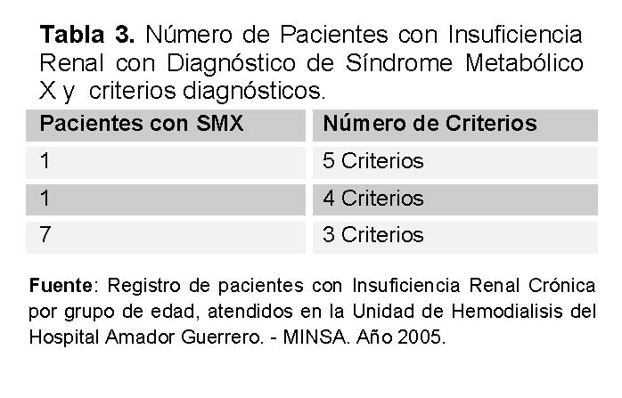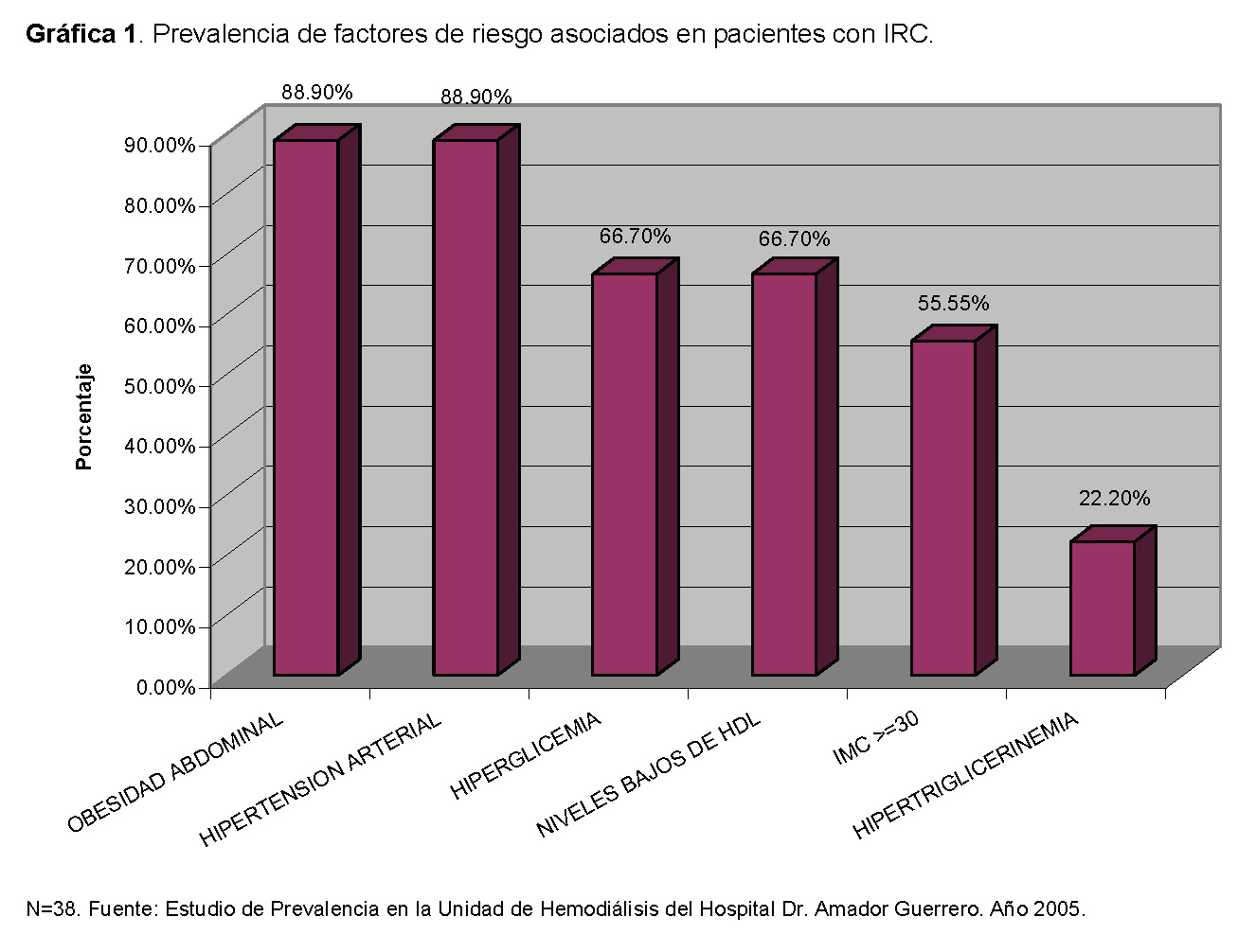 Introduction: Metabolic syndrome X (MSX) encompasses risk factors such as abdominal obesity, hypertension, dyslipidemia, and insulin resistance, which significantly increase cardiovascular morbidity and mortality. In patients with chronic kidney disease (CKD), the presence of MSX is even more relevant, as it accelerates disease progression and increases cardiovascular complications. A retrospective, descriptive study was conducted in which patients treated at the Hemodialysis Unit of Dr. Amador Guerrero Hospital were evaluated, and the presence of cardiovascular risk factors and components of MSX was quantified. Justification: Metabolic syndrome is highly prevalent in patients with chronic kidney disease and increases cardiovascular risk, making its identification essential to improve clinical outcomes. Methodology: Patients with chronic kidney disease undergoing dialysis in the province of Colón during 2005 were studied. Anthropometric and laboratory data were collected, and metabolic syndrome was diagnosed according to the NCEP/ATP III (2005) criteria. Data analysis was performed using EPI-INFO 6.0. Results: A prevalence of 23.7% of MSX was observed among patients treated at the unit. Of these patients, 88.9% presented abdominal obesity and arterial hypertension. However, only abdominal obesity and insulin resistance (measured as fasting hyperglycemia) were statistically significant for the presence of MSX in CKD patients, with reported ORs of 38.4 (95% CI: 3.88–379.70, p<0.05) and 6.28 (95% CI: 1.23–31.95, p<0.05), respectively. Conclusion: The prevalence of MSX in the studied population was 23.7%. Abdominal obesity and insulin resistance significantly increased the likelihood of MSX. Furthermore, current evidence suggests that genetic variants may predispose CKD patients to the development of MSX, opening new avenues for research.