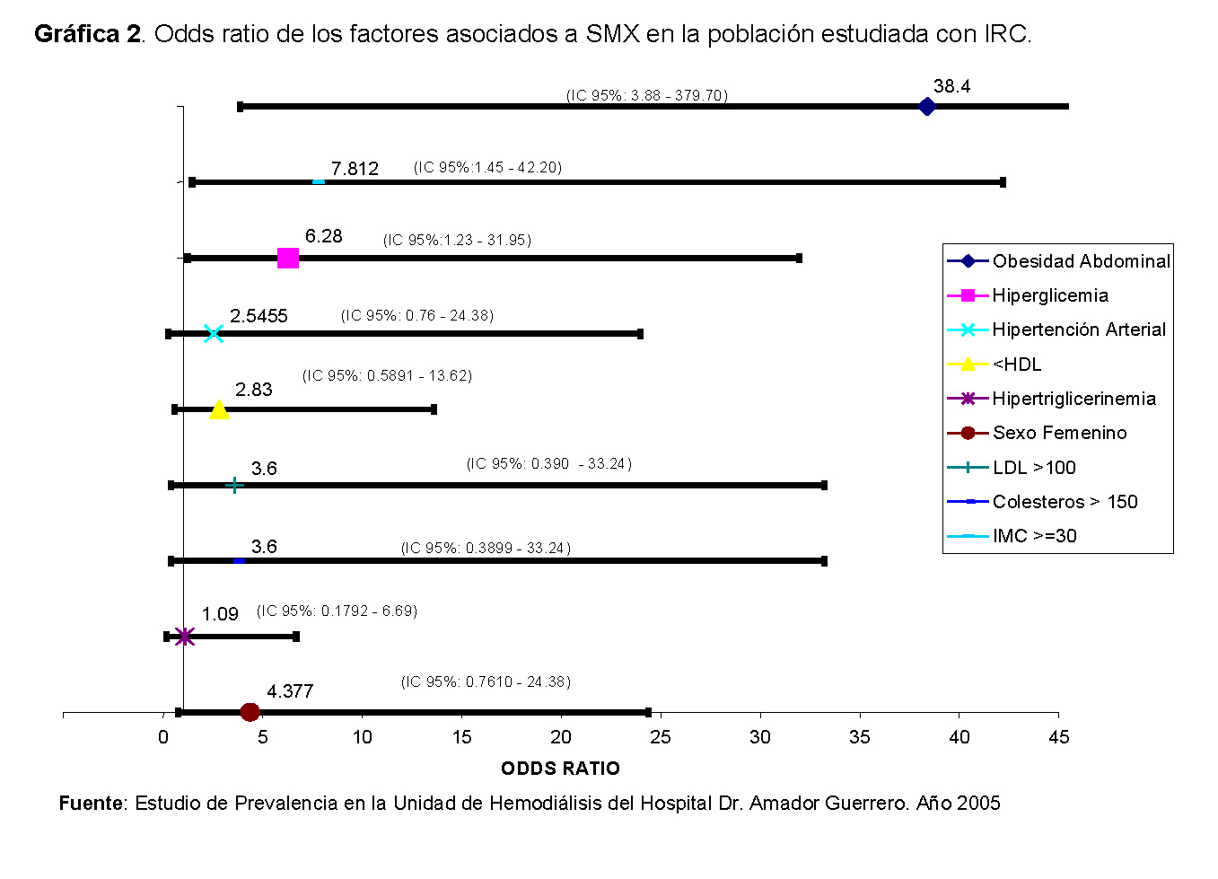 The results obtained show a clear hierarchy in the strength of association of the factors studied with the presence of metabolic syndrome X (MSX). Abdominal obesity presented an OR of 38.4, meaning that patients with this finding are 38 times more likely to develop MSX compared to those without abdominal obesity. This extremely high value highlights abdominal obesity as the most important and determining risk factor in this cohort of patients with chronic renal failure (CRF).