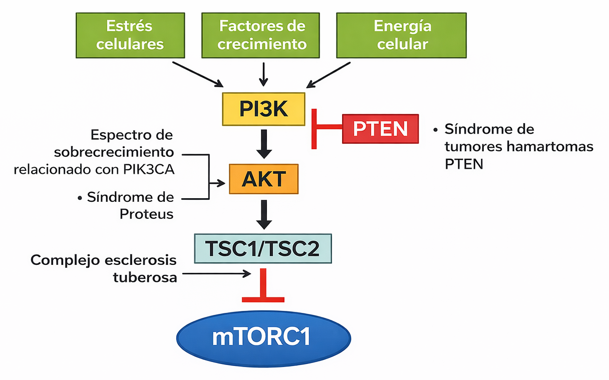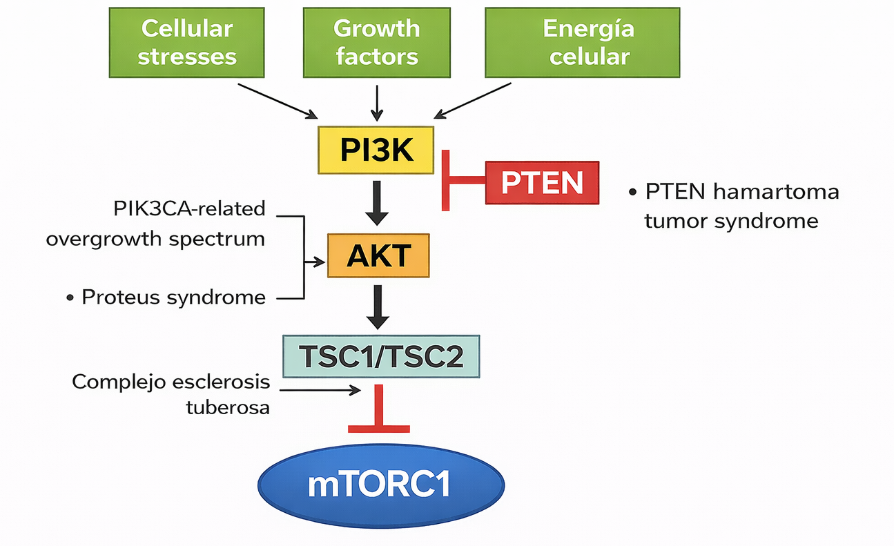 Proteus syndrome is related to a dysregulation of the PI3K-AKT pathway. On one hand, the PI3K protein is phosphorylated, activating transcriptional activation of the vascular endothelial growth factor (VEGF) and the expression of the hypoxia-inducible factor 1α (HIF1α) angiogenesis, growth, senescence, and other processes, through molecular mechanisms (See Figure 1 and 2) (Pinzón C, Serrano M, Sanabria M, 2009).