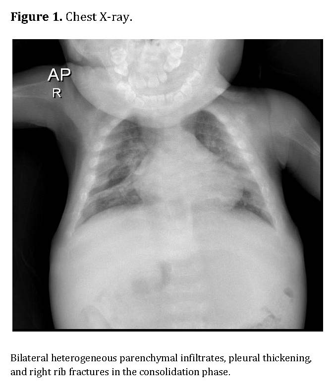 He was admitted due to progressive respiratory distress, fever, and irritability. On initial physical examination, he had hypoxemia, subcostal retractions, and poor peripheral perfusion, rapidly progressing to septic shock of pulmonary origin.