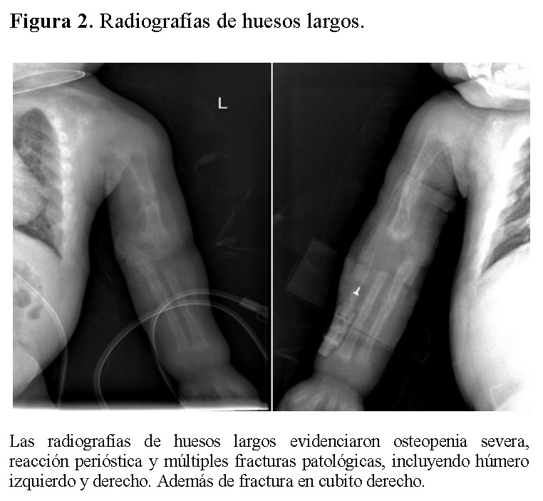During the acute respiratory phase, community-acquired pneumonia was diagnosed, requiring management in the intensive care unit, high-flow oxygen, and vasoactive support with norepinephrine. During hospitalization, blood cultures were positive for extended-spectrum beta-lactamase–producing Klebsiella pneumoniae; consequently, targeted antibiotic therapy was indicated. During comprehensive evaluation, abnormal skeletal findings were identified, prompting directed radiological and metabolic studies.