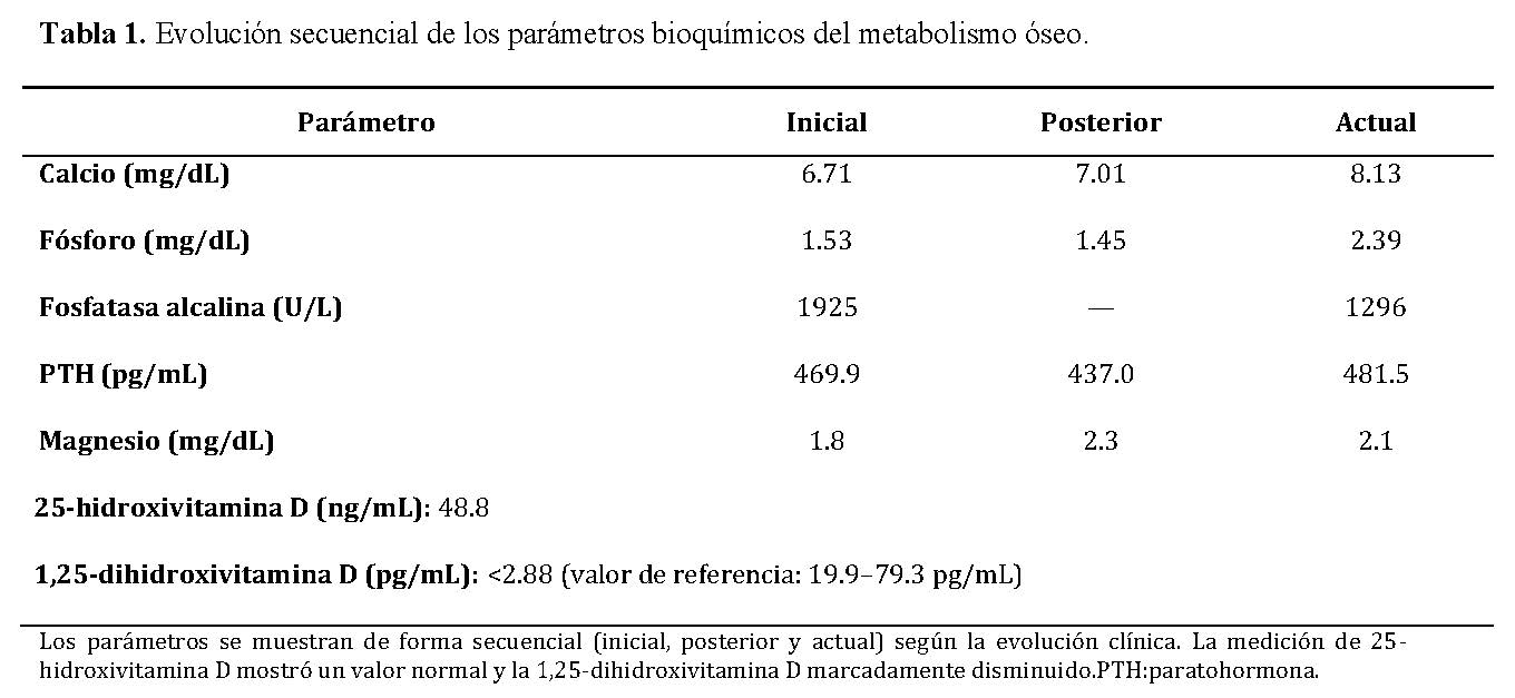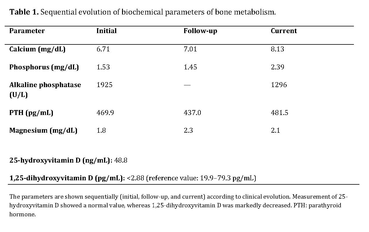 The sequential evolution of biochemical parameters is summarized in Table 1, showing persistent hypocalcemia, marked secondary hyperparathyroidism, and a progressive decrease in alkaline phosphatase after initiation of treatment.